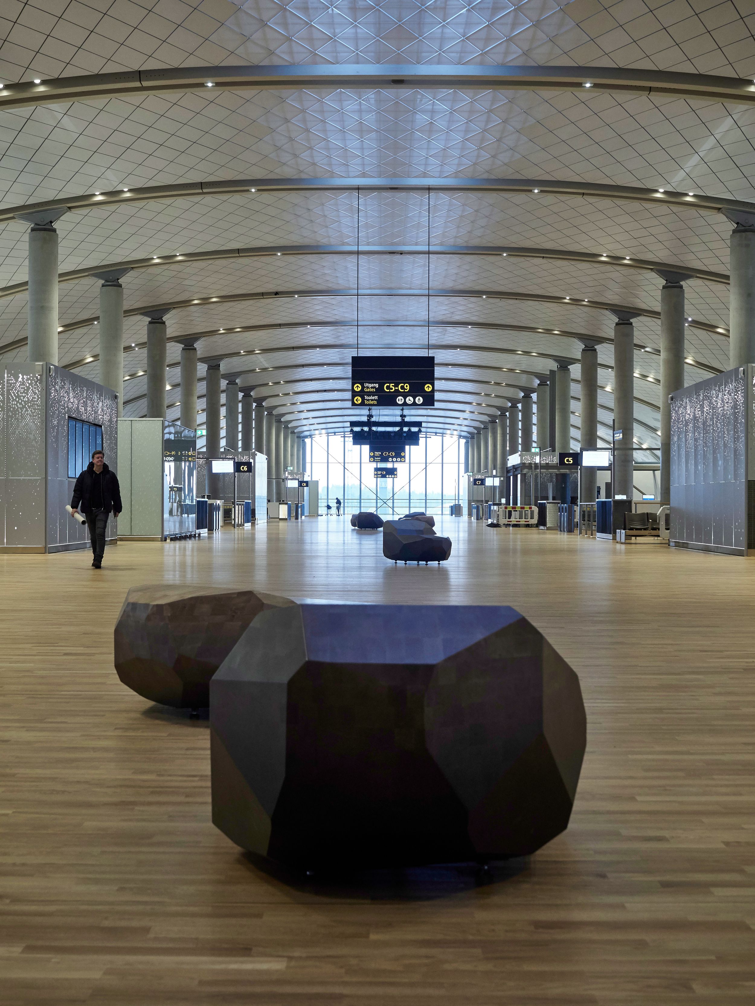 Nordic Office of Architecture, the architects behind the extension of the terminal in Oslo asked if we could design alternative seating. Traveling can be a stressful experience for many people and research shows that the field of vision shrinks, when we are in transit. With these alternative seating objects, the goal was to introduce a solid piece of wood, to give a tactile experience to the traveler. The unusual seating positions also mean that you can find yourself with your feet dangling, like you are sitting on a pier or a ledge in the mountains. In addition to the alternative seating we also designed a series of small islands, for work or relaxation. The islands were shielded off by upholstered walls and wooden structures to shield the traveler and provide some sense of ease and comfort.