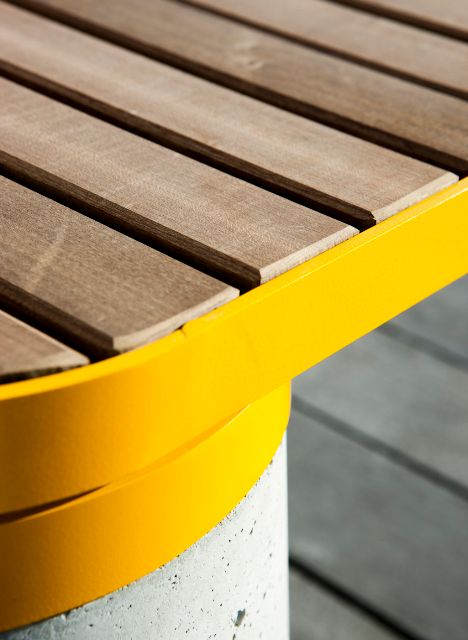 The construction of the bench is held togeter by a singel screw. The concrete base was to add weight as the benches were designed for public spaces but also roof top terraces where fastening to the floor could be difficult.