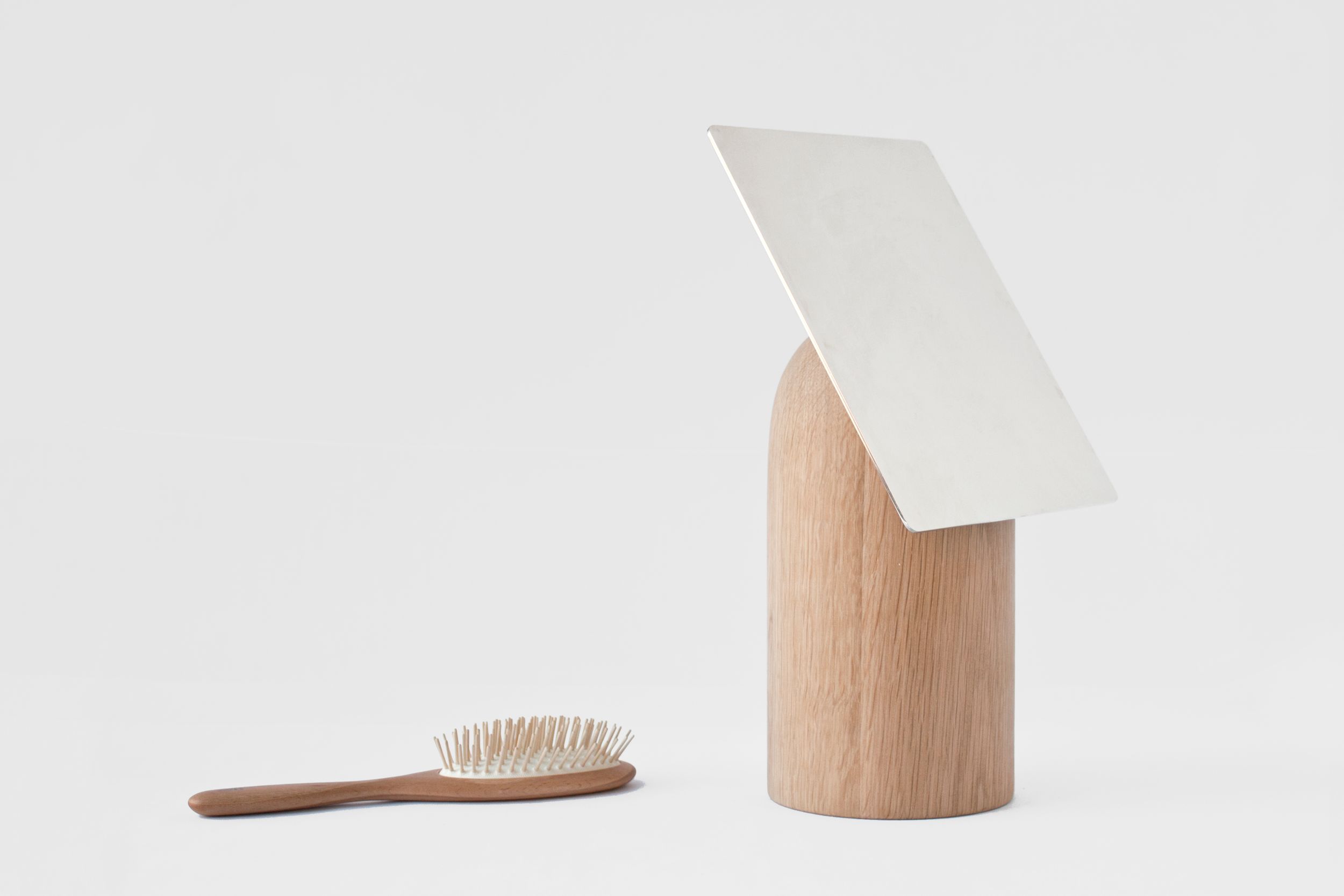Stone wood mirrors is a series of small hand held mirrors, and larger stationary mirrors. They share the common rounded base, either in turned pine, or in picasso stone. The mirror is a sheet of stainless steel polished to mirror finish. The mirror is reflective on both sides, enhancing the shape of the base when the product is viewed from behind.